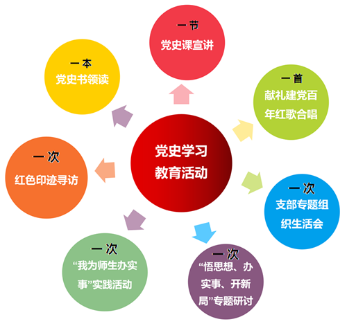 活动包括:一次红色印迹寻访、一本党史书领读、一节党史课宣讲、一首献礼建党百年红歌合唱、一次“我为师生办实事”实践活动、一次“悟思想、办实事、开新局”专题研讨、一次支部专题组织生活会。
