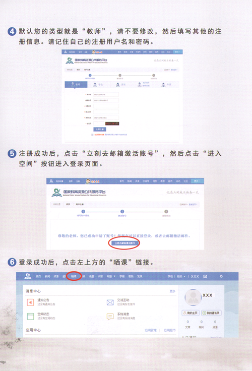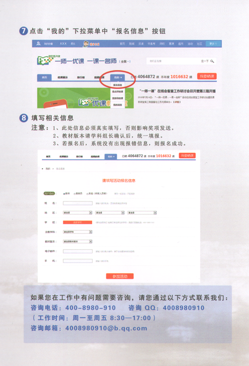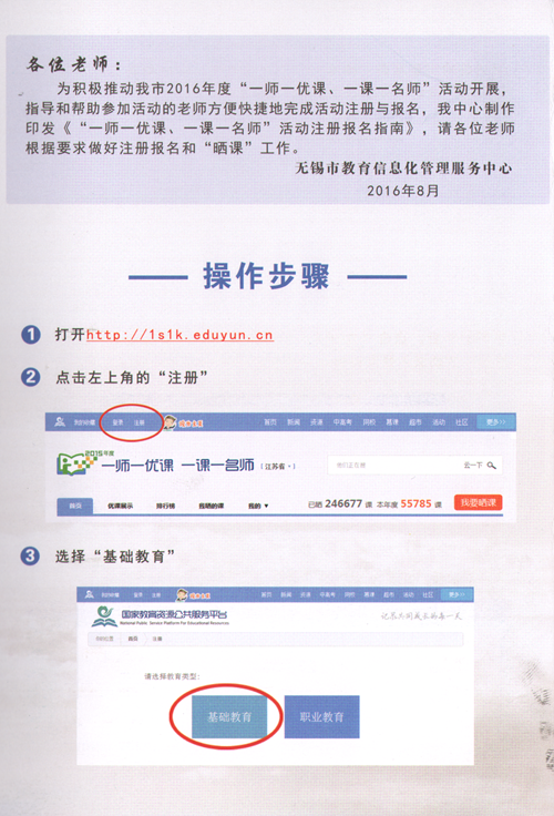 9月7日前请老师们上网完成注册工作,具体注册方式详见《活动注册报名指南》,学校管理员黄锡建老师将对注册工作进行审核,同时请老师们于9月20前完成晒课内容的上传工作。请之前有课堂实录资料的老师尽快与学校教务处联系,学校将于9月7日前确定参与优课活动的老师名单并上报,并于9月20日前完成优课内容的上传工作。