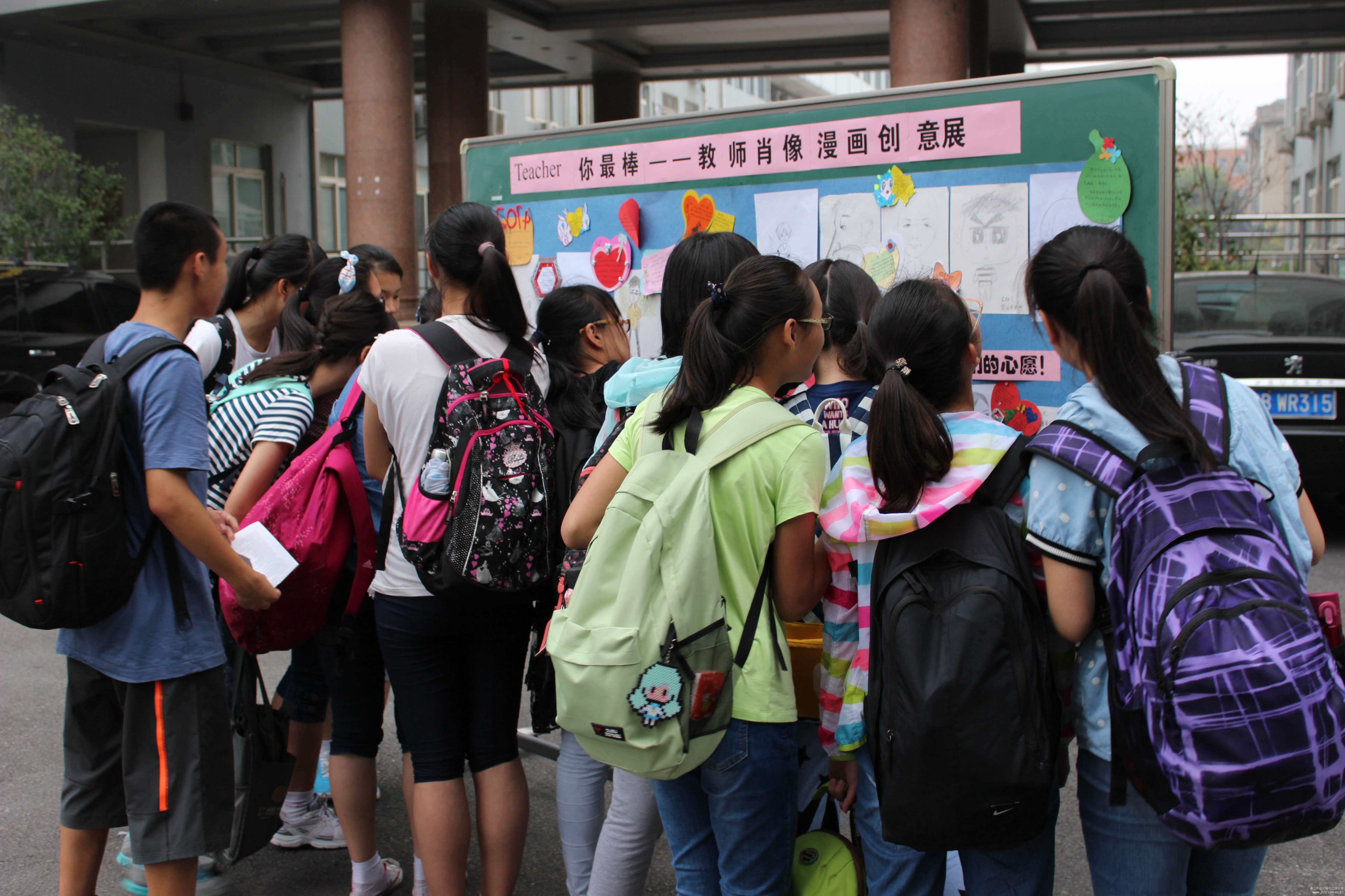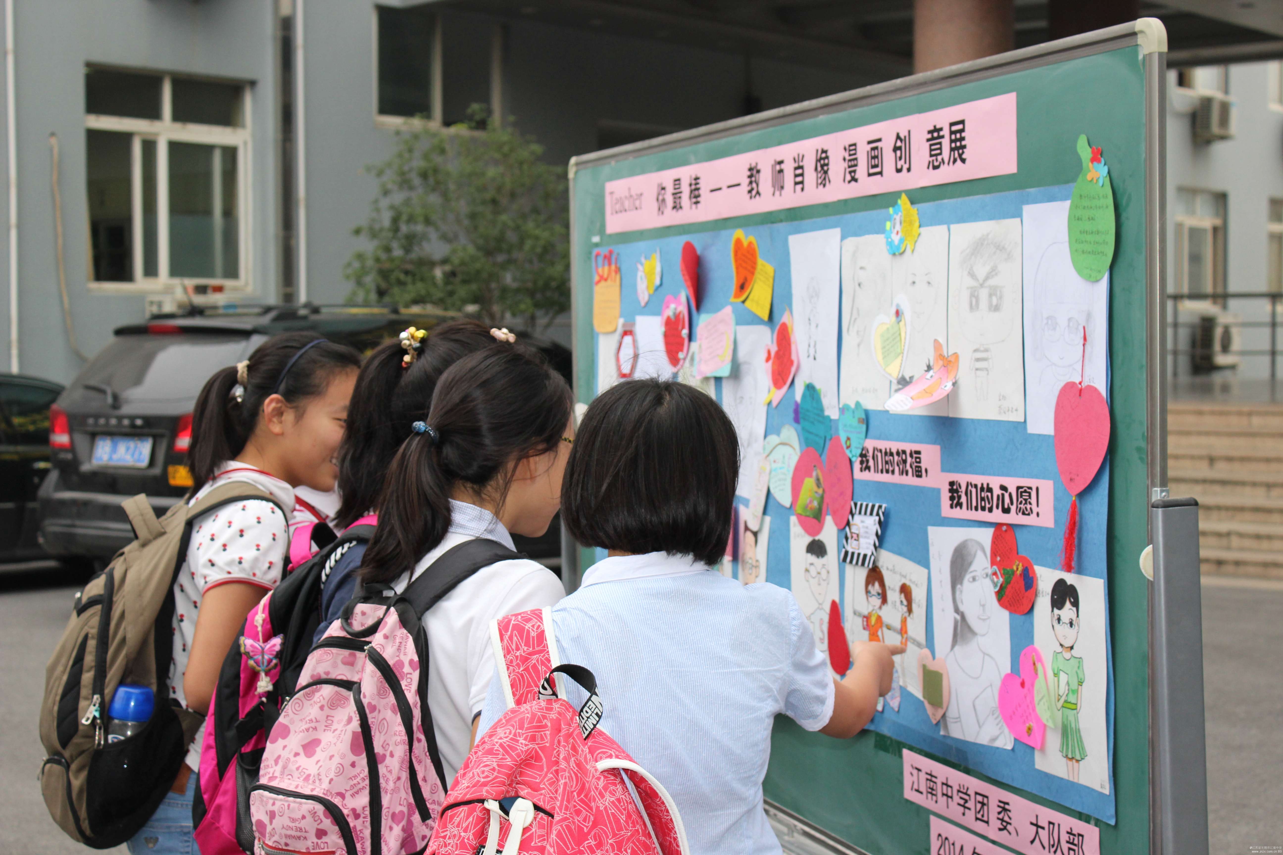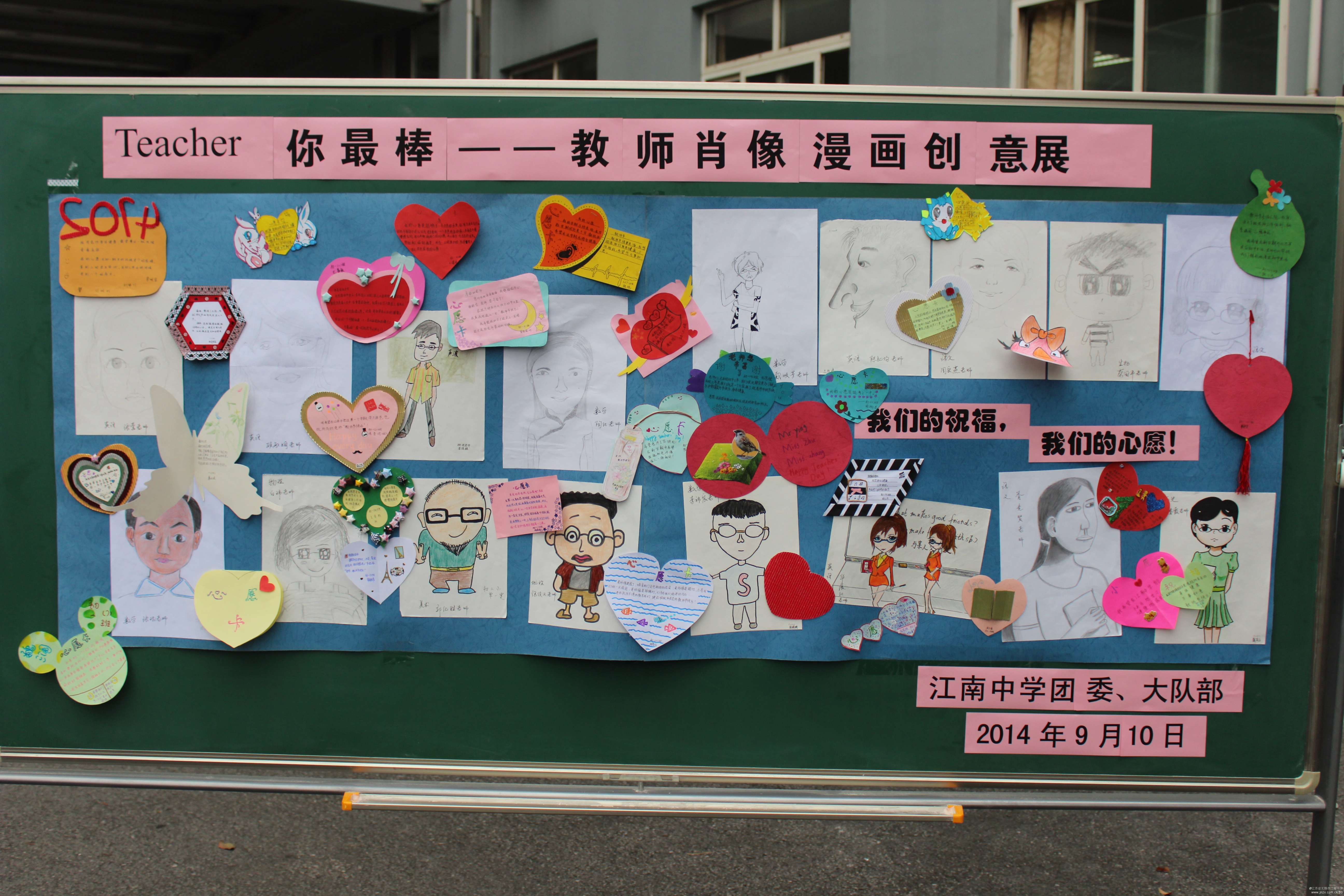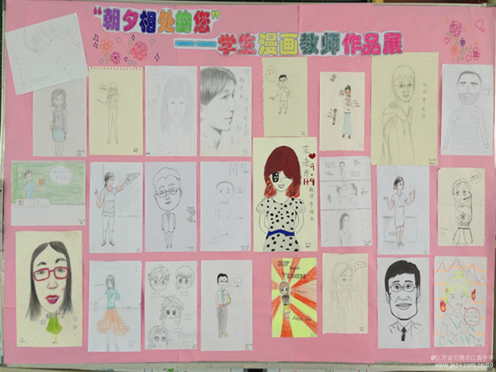 在这个教师节里最精彩动人的活动当数校团委、大队部精心策划和组织的教师肖像漫画创意展。初二年级的同学们兴致高昂地拿起画笔,把和他们朝夕相处了一年有余的老师们用略显夸张的漫画造型勾勒了出来,画面诙谐生动、匠心独运。有的同学还在画作中配上了老师们日常教学中的口头禅,让人看了忍俊不禁——杨锋老师的青春儒雅、周晓辉老师的帅气时尚、蔡国丰老师的阳光蓬勃、华展红老师的清秀俊丽……被学生们在画纸中淋漓尽致地展现了出来,观看的师生们无不“伸颈、侧目、微笑、默叹”。