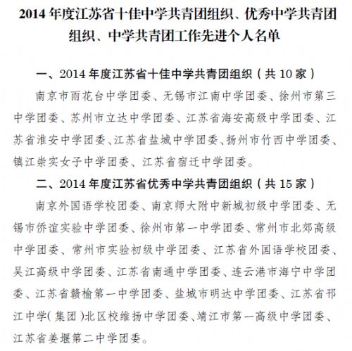 2015年2月,在江苏团省委举行的中学共青团工作考核评优中,我校团委获得了“2014年度江苏省中学十佳共青团组织”的荣誉。