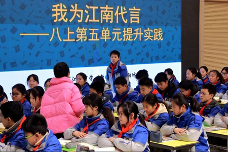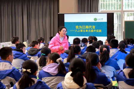 活动中,江南中学向冰凝老师和匡园双语学校何巧玲老师分别开设展示课。向冰凝老师以“我为江南代言”为主题词创设情境,带领学生走出课本,学习使用说明性语言向在场老师介绍江南中学。在师生热烈的讨论中,学生透过课堂走向生活,体会语文的广泛应用性和深厚人文之美。