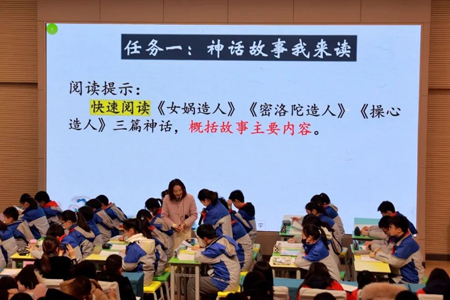 何巧玲老师以文学社刊物征集稿件为情境,带领学生共同研读《女娲造人》《密洛陀造人》《操心造人》三则神话,师生共与天神对话、溯文明之源。何老师精细钻研课标、精准把握教材、精心设计活动,通过巧妙的教学环节设计培养了学生团结合作、积极探究的精神。